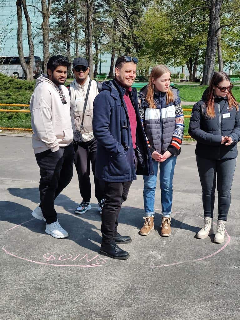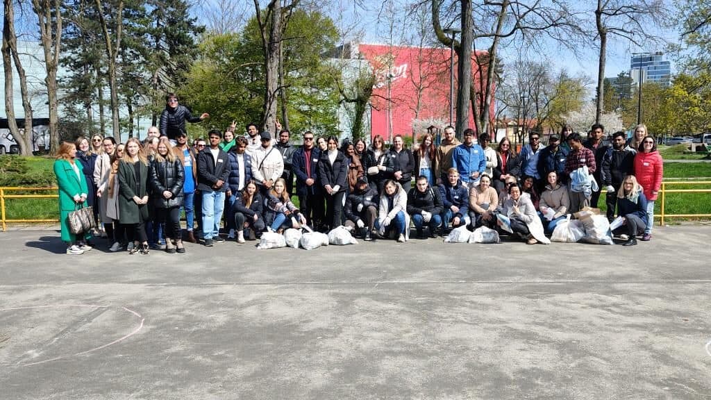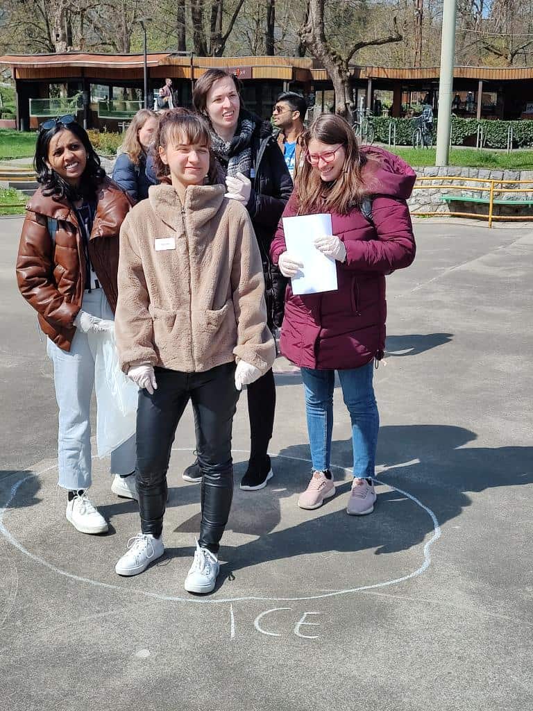 Mednarodna zasedba se je po slovensko-indijskem kosilu odpravila na poučno-zabavno ekipno tekmovanje v park Tivoli, kjer so študenti računali svoj ogljični odtis in dobrodejni vpliv dreves, kolesarili in tekli ter pobirali smeti.