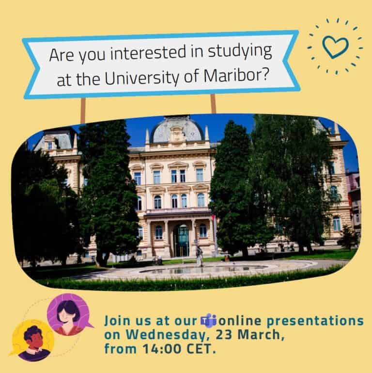 Join us on MS Teams on Wednesday, 23 March, at 14:00 CET. You will hear useful info about our university, study offer of our faculties and the application/registration procedure. We will also try to answer all your questions, related to the University of Maribor.