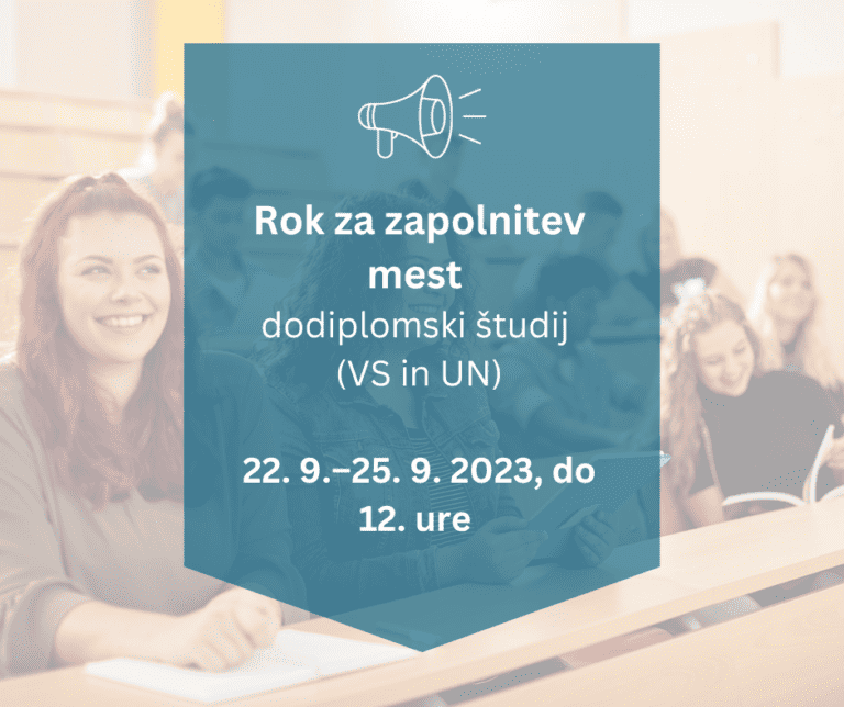 POSREDOVANJE DOKAZIL K PRIJAVI ZA VPIS: V prijavno-sprejemnih postopkih za vpis v študijsko leto 2023/24 morate elektronsko preko portala eVŠ oddati tudi vsa k prijavi zahtevana dokazila. Preberite si več o tem, kako oddati dokazila hkrati s prijavo za vpis in kako naknadno (odpiranje v novem zavihku).