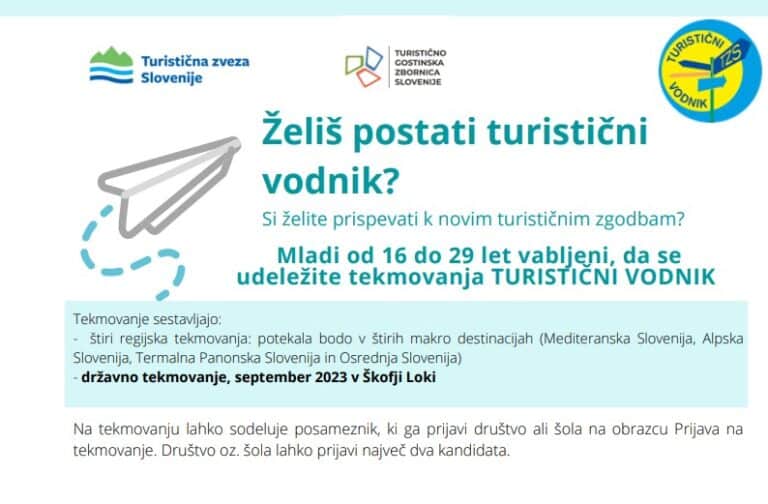 Turistična zveza Slovenije razpisuje 10. tekmovanje za TURISTIČNEGA VODNIKA, ki je namenjeno mladim od 16 do 29 leta. Turistični vodnik je eden glavnih povezovalnih členov med različnimi kulturami in hkrati tudi eden najpomembnejših predstavnikov destinacije. Nanj se gostje/turisti obračajo za nasvete, zato sta pomen in vloga turističnega vodnika zelo velika. Posamezniku nabor neformalnega znanja odpira prostor za razvijanje novih veščin in spretnosti, pridobitev izobrazbe, mogoče celo zaposlitve. Glavna nagrada je brezplačno opravljanje izpita za pridobitev nacionalne licence za turistično vodenje.